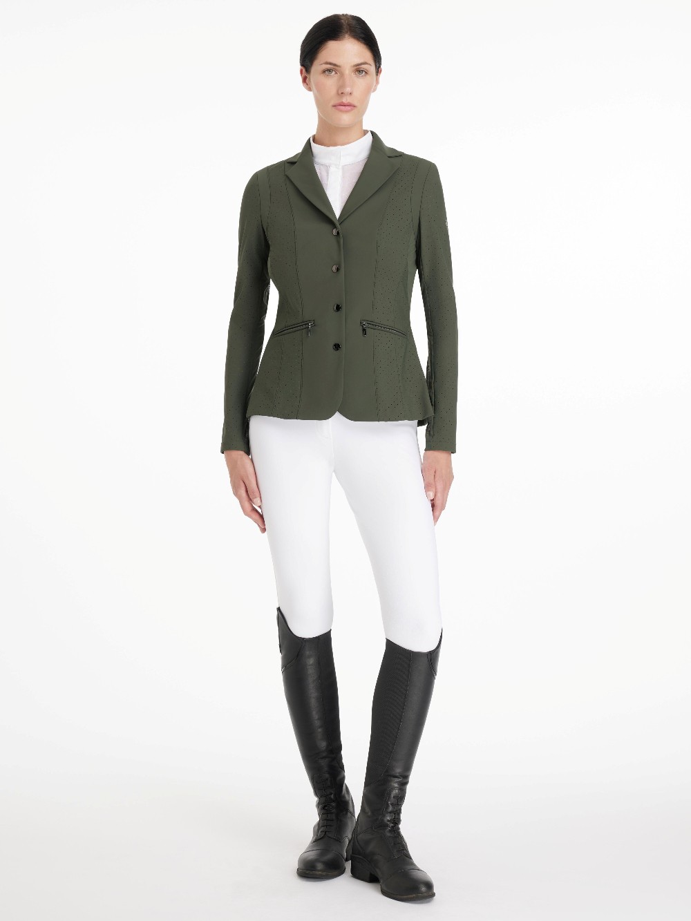 Competing in hot climates can be challenging, but this specialist technical performance jacket makes beating the heat a breeze.It's a lightweight, breathable show jacket designed to take care of the temperature so you can focus on performing your best. Perforated panels and ultra-fine mesh under the arms and armpits ensure ventilation and airflow, no matter how hard you work. With elegant yet sporty contour seam lines and exposed zip pockets, it uses minimal fabric to maximum effect, to fit and flatter your figure as you ride.