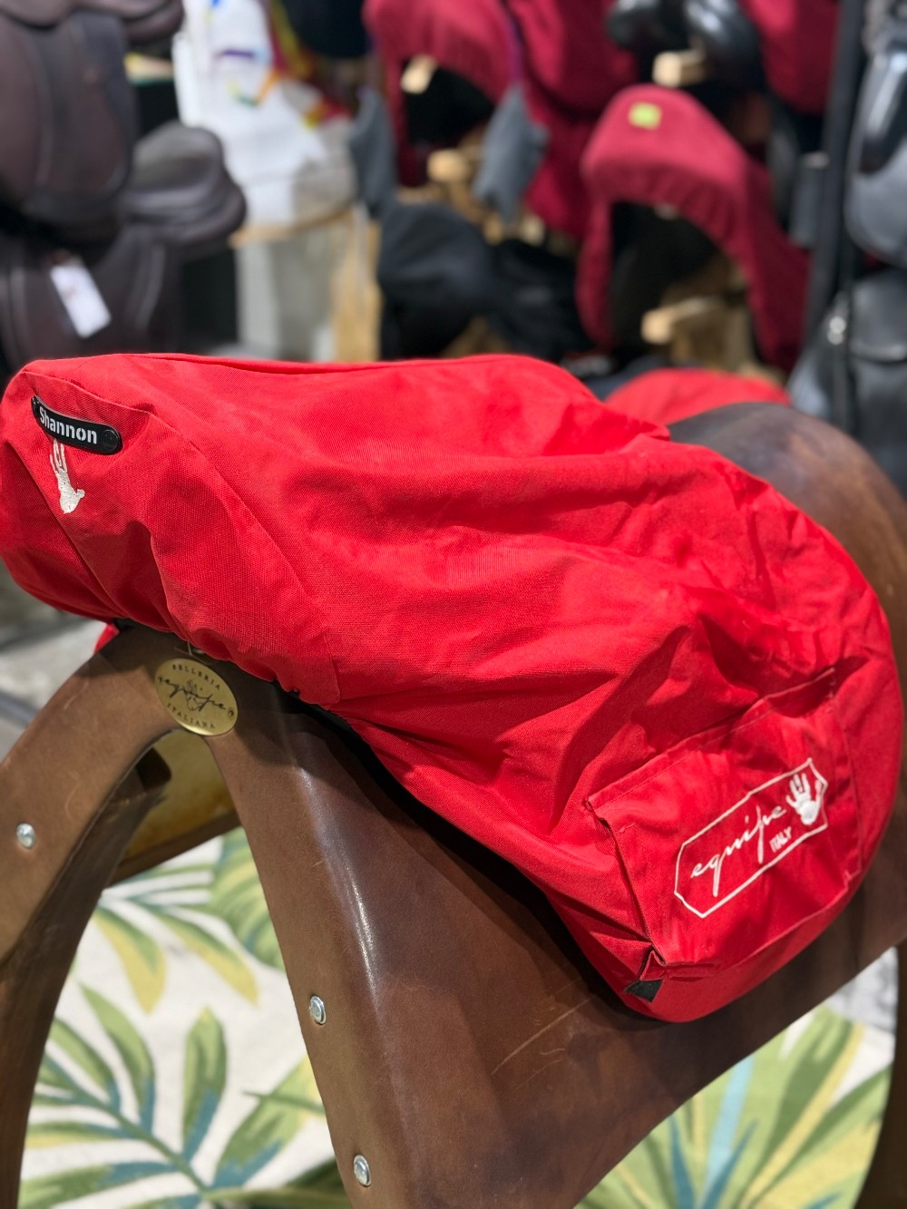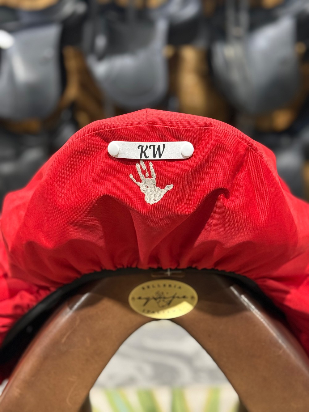 No more writing on saddle covers!! Put the horse's or rider's name on the badge and easily change it when needed. These handy name badges snap on and off. The price incudes a name of your choice heat transferred on to the badge and installing the snaps on to the cover. If ordered online; please put the name you would like on the badge in the comments of the order. You then bring the cover in to the shop when the badge is ready and we will put it on while you wait.
